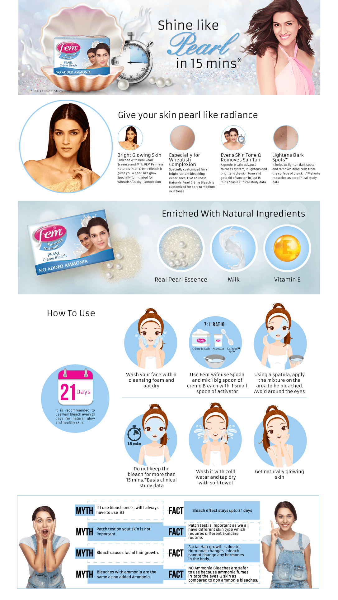 Background:Dabur Fem Bleach Pearl is a premium skincare product designed to provide a radiant, glowing complexion by lightening facial hair and pigmentation. The product is marketed as a solution for women looking to brighten their skin and achieve a healthy, luminous appearance. Our task was to develop A+ content that would effectively showcase the product’s benefits and create a visually appealing experience for online shoppers.